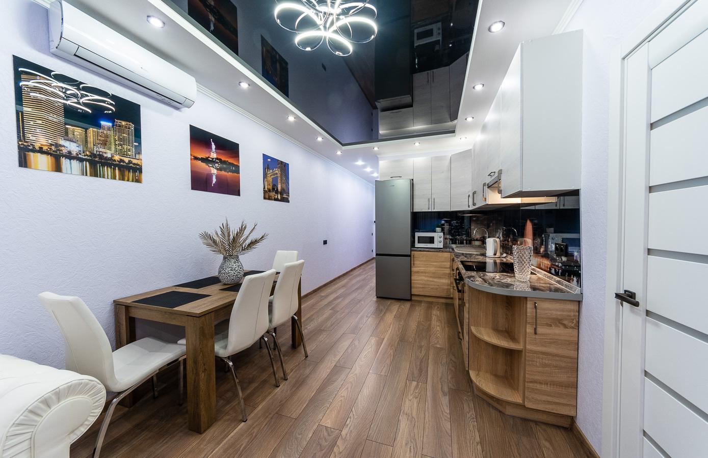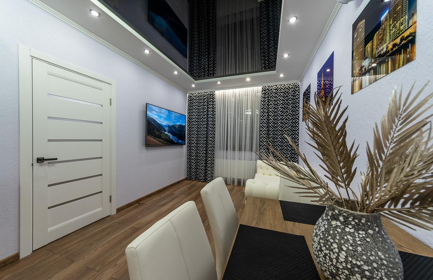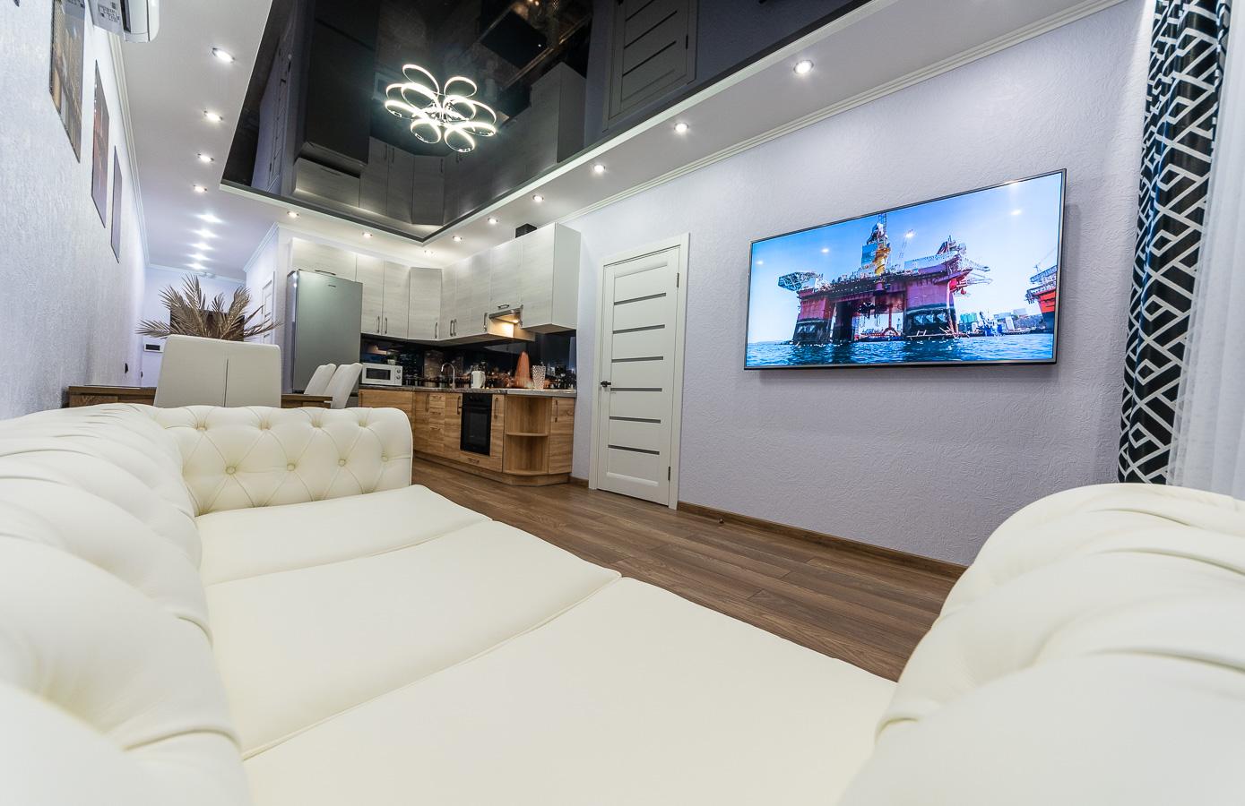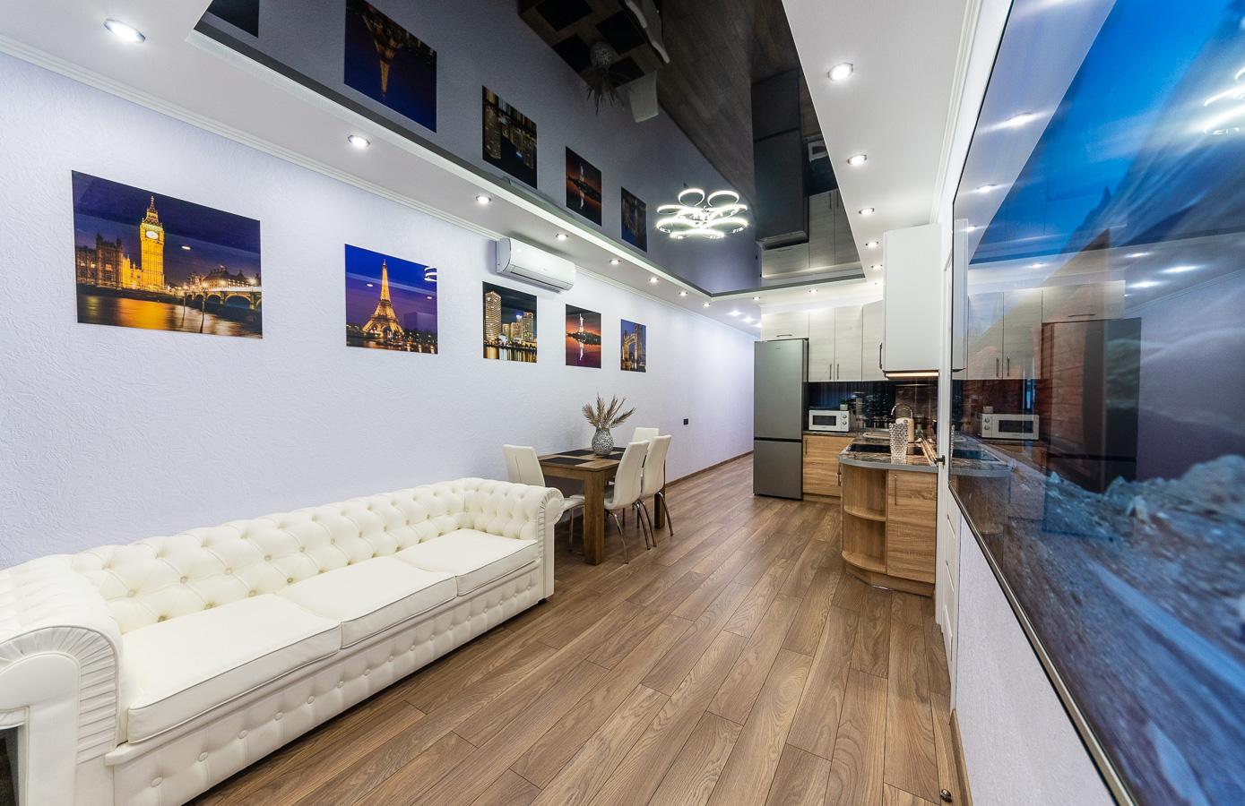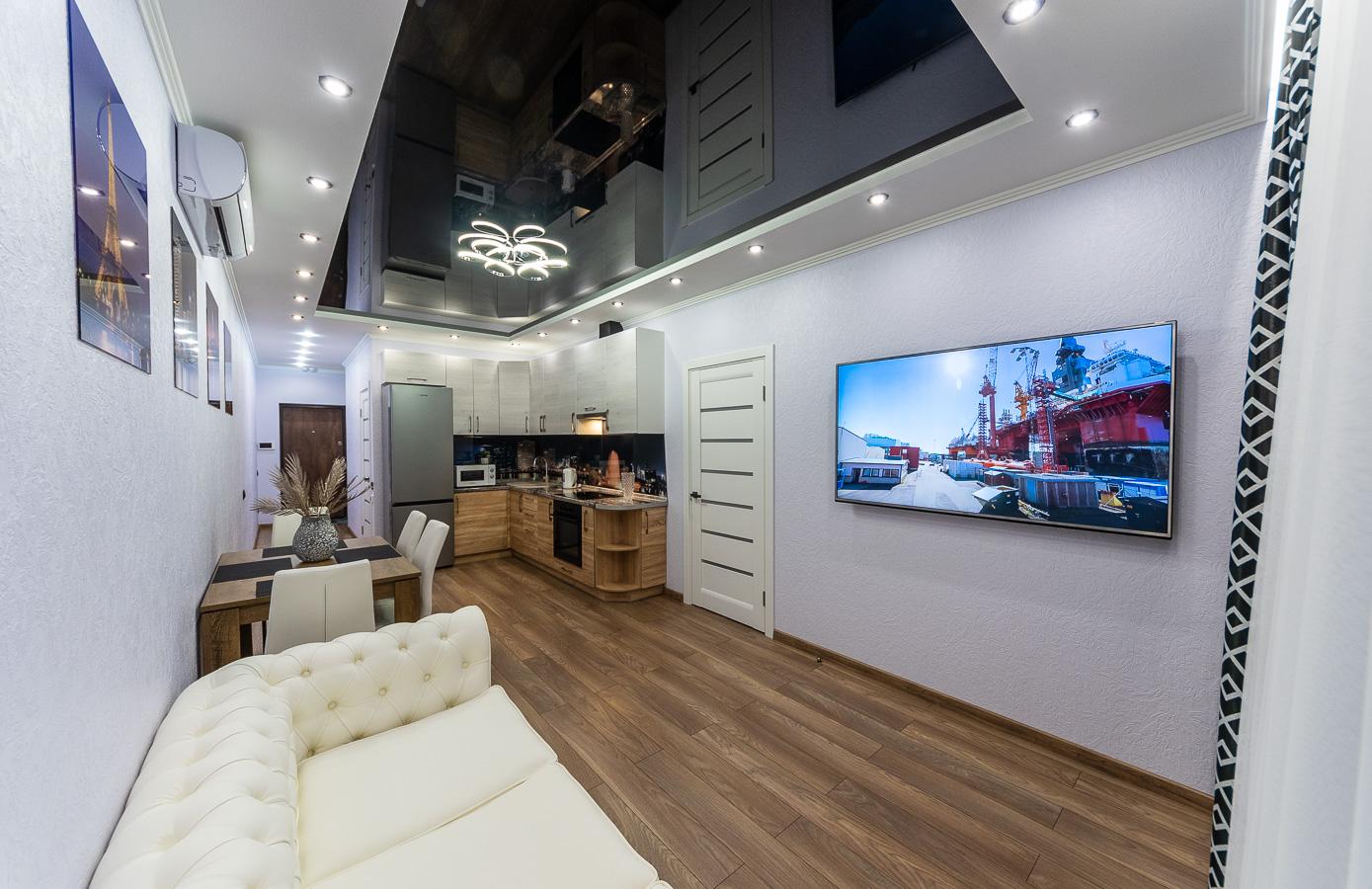 The apartment features a bright, modern interior with дизайнерский renovation using high-quality materials. Every detail is carefully designed: mirrored ceiling, modern lighting, elegant decor, and a cozy atmosphere that reflects a premium lifestyle.