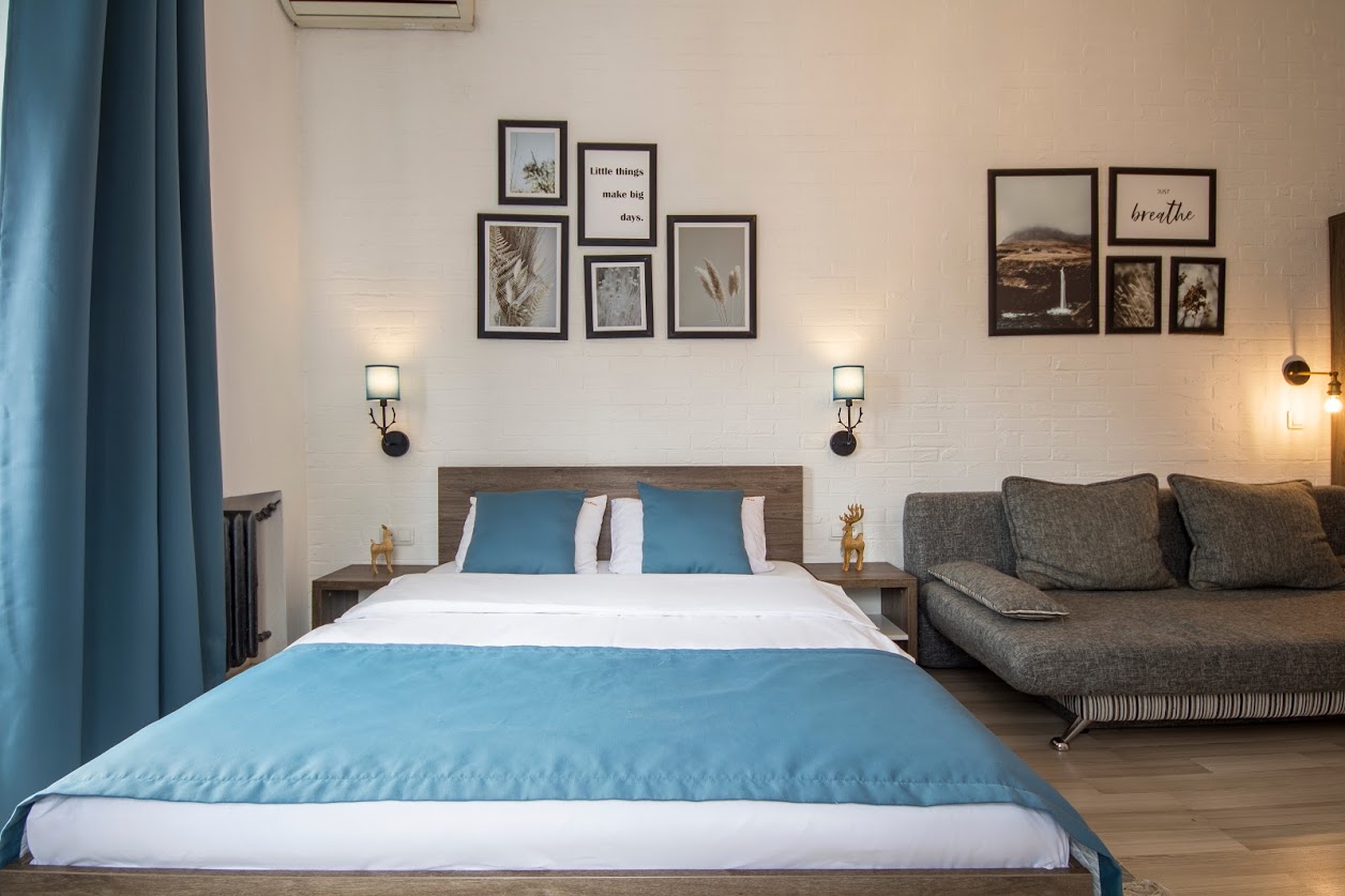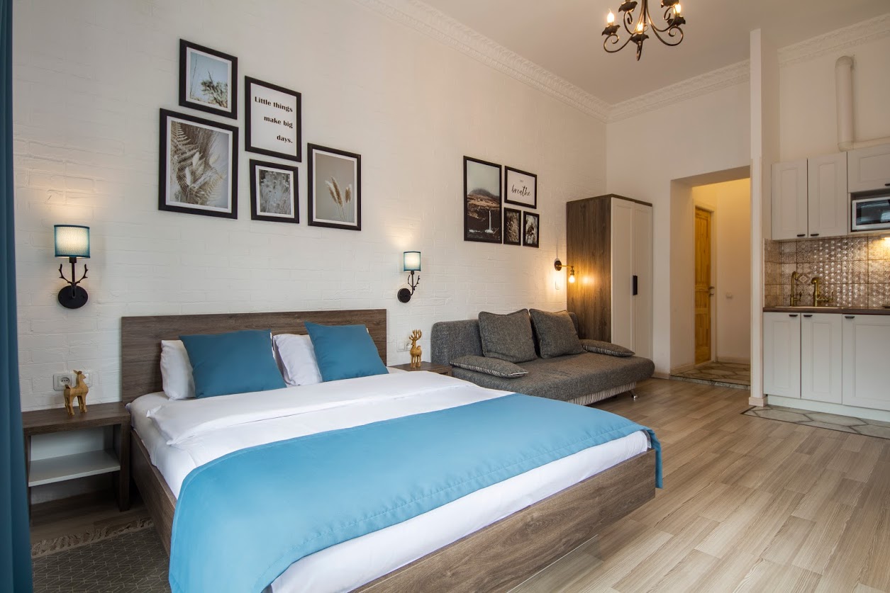 New studio apartment 2020 with cozy bedroom, a kitchen, a shared bathroom with shower and a balcony. The windows overlook Basseynya and Khreschatyk streets