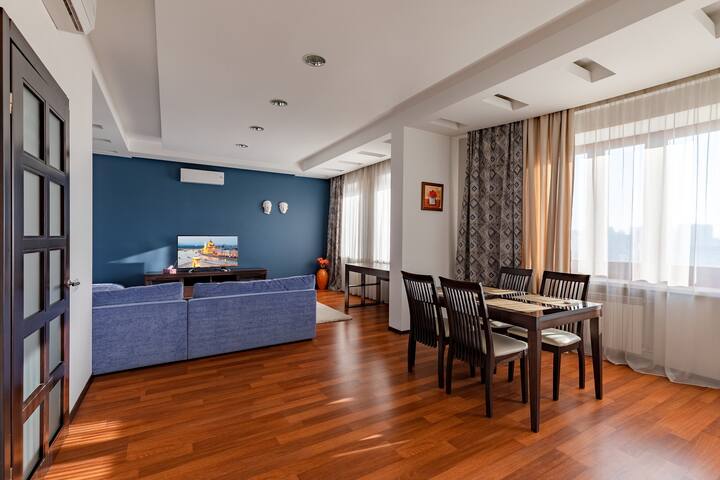 Studio apartment near Lva Tolstoho square, in a new elite house. It is a luxury apartment. There are large studio living room, fitted kitchen and appliances, bedroom with dressing room, bathroom with toilet, plus a second bathroom, closet for outerwear in the hallway. Connected Internet, smart TV are provided. The apartment is a viewport, there is a panoramic view of the city from the windows, the house has a concierge, a magnetic lock at the entrance, there is a parking lot, guarded parking.